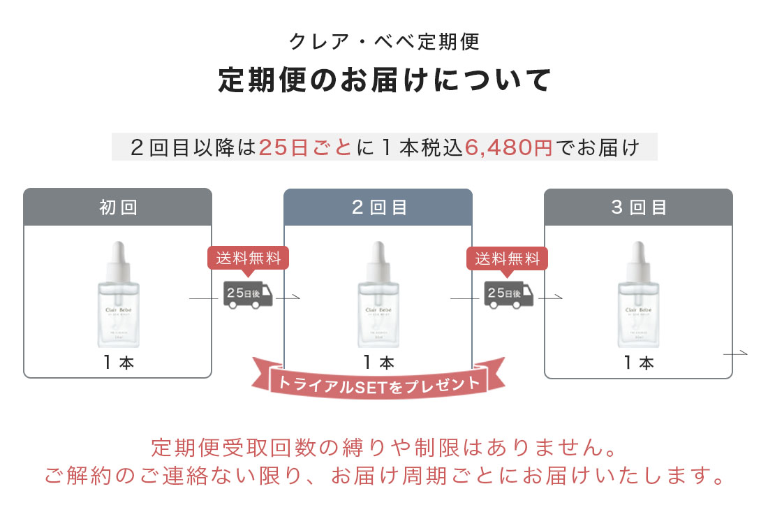 【定期便について】ご解約のご連絡ない限り、25日ごとに商品をお届けする回数縛りのない定期便です。クレア・ベベ定期便の価格は、初回1本1,980円(税込)、2回目以降は1本6,480円(税込)となります。