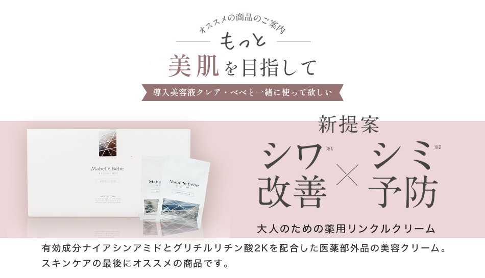 整った肌作りとそのお肌をキープするためには、良好なターンオーバーと保湿、そしてバリア機能が最適な状態である事が重要です。せっかく時間をかけて選んだスキンケアを無駄にしないために、そして、理想の肌を実現させるためにも、導入美容液クレアベベをプラスすることをおすすめします。