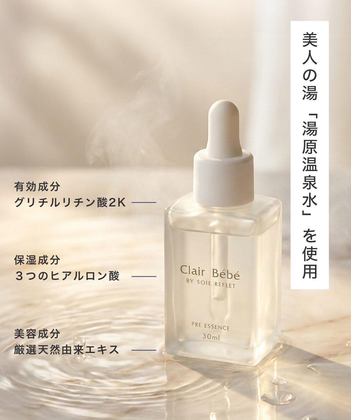 有効成分グリチルリチン酸2Kを配合した医薬部外品の導入美容液クレアベベ。岡山県真庭市にある自然噴出した温泉のみを使用する希少な温泉「湯原温泉」。その美人の湯としても有名な湯原温泉水を贅沢に配合しました。さらに厳選した植物由来の美容成分にヒアルロン酸もたっぷり配合しています。