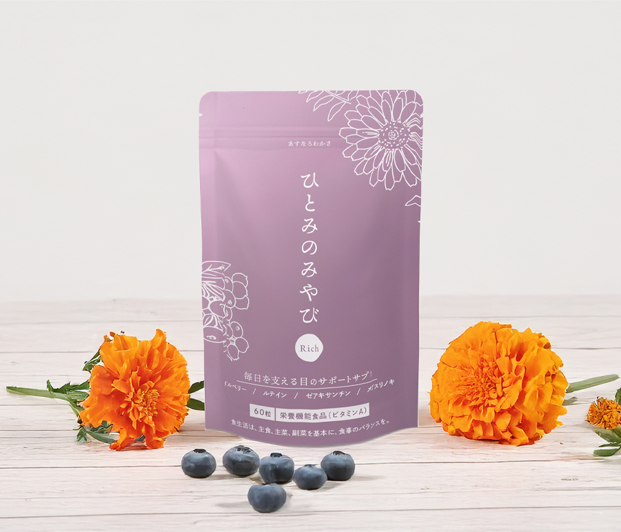 アントシアニンをたっぷり含んだビルベリーに、ルテイン・マリーゴールド、さらにメグスリノキも配合しました。PC作業や車の運転をする方、スマホで疲れた目にもぴったりのサプリメントです。