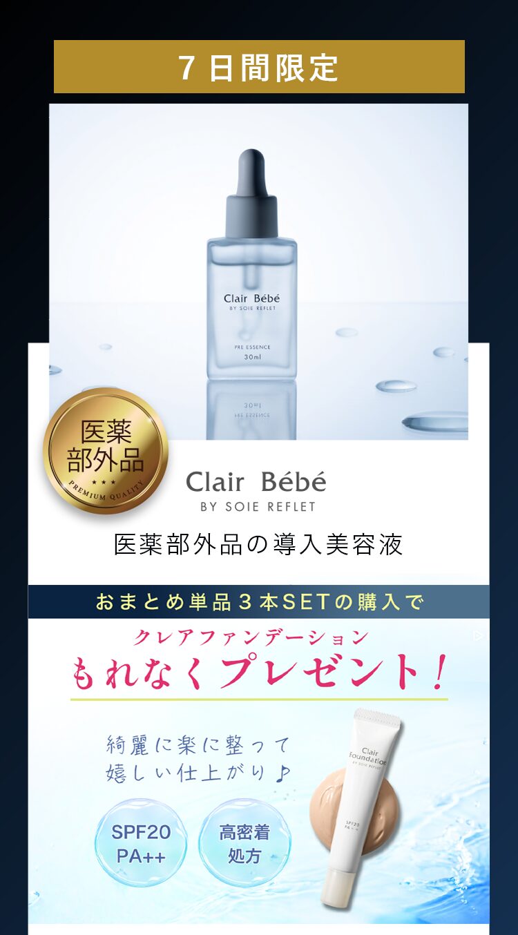 『医薬部外品 導入美容液クレア・ベベ』通常価格税込9,980円を買い切り特別価格でお届けします。また、より多くのお客様にお試しいただくため、1世帯様あたりの購入制限を設けております。